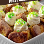Once out of the oven, let the casserole sit uncovered for 5 minutes. This resting time is key—it allows the custard to set fully, making it easier to slice and serve without falling apart. Before serving, dust generously with powdered sugar, sprinkle a bit more cinnamon, add dollops of whipped cream, and scatter green sprinkles if you want that festive pop. Serve warm and enjoy the decadent layers of flavor and texture!