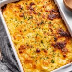This classic Au Gratin Potatoes recipe features thinly sliced Yukon Gold potatoes baked in a rich and creamy cheese sauce made with cheddar, gruyere, and parmesan. Tender potatoes layered with sautéed onions and a flavorful, cheesy béchamel sauce create the perfect decadent side dish for any holiday or special occasion meal.