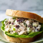 A delicious and creamy cranberry chicken salad featuring chopped cooked chicken, dried cranberries, crunchy walnuts, fresh dill, and a hint of orange zest, combined with mayonnaise for a flavorful and easy-to-make dish perfect for sandwiches, wraps, or green salads.