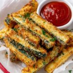 These crispy baked zucchini fries are coated in a savory mixture of Parmesan cheese, panko breadcrumbs, and Italian seasoning for a delicious and healthy snack or side dish. Perfectly golden and flavorful, they are a great way to enjoy veggies with a satisfying crunch.