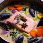 Salmon á la Nage is a delicate and flavorful French dish featuring salmon poached gently in a fragrant broth made with rosé wine, fish fumet, aromatic herbs, and spices. This cooking method ensures tender, moist salmon complemented by mussels, asparagus, and a light, aromatic nage sauce, perfect for an elegant dinner.