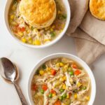 - Serve: Spoon the chicken pot pie filling into bowls or plates and top each serving with a freshly baked biscuit. Enjoy this comforting meal hot from the crock pot!