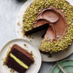 - Assemble the Cake: Place one cake layer on a serving plate. Spread the pistachio white chocolate cream evenly over the top. Place the second cake layer on top.
