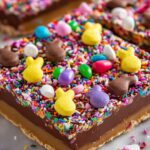 - Press Easter candies gently into the melted chocolate to ensure they adhere well and don’t fall off when cutting.