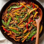 - Sauté the Vegetables: Add the remaining 1 tablespoon of olive oil to the skillet. Stir in the sliced bell peppers, snap peas, and the white parts of the green onions. Cook, stirring frequently, until the vegetables are tender but still crisp, about 4-5 minutes.