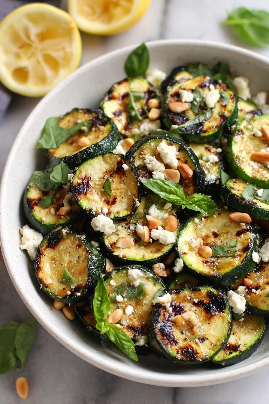 A fresh and flavorful summer side dish featuring thick slices of grilled zucchini tossed with a zesty lemon-garlic vinaigrette, crumbled feta cheese, and fresh basil, topped with optional toasted pine nuts for added crunch.