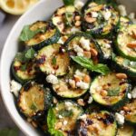 - Toss: Gently toss the grilled zucchini with the crumbled feta, fresh basil, and the lemon-garlic vinaigrette until evenly coated.