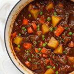 This gluten-free beef stew is a hearty and comforting dish featuring tender chunks of beef simmered with vegetables, crushed tomatoes, and fragrant herbs. Perfect for a cozy meal, it offers rich flavors with a thickened broth and a touch of fresh peas for added sweetness.