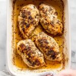 - Bake: Place the baking dish in the oven and bake the chicken for 33 minutes or until the internal temperature reaches between 162 and 165 degrees Fahrenheit, ensuring the chicken is fully cooked but still juicy.
