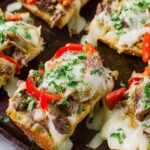 Philly Cheesesteak Garlic Bread combines tender shaved steak, sautéed peppers and onions, melted provolone and mozzarella cheeses on a crispy, buttery garlic bread base for a deliciously satisfying appetizer or main course.