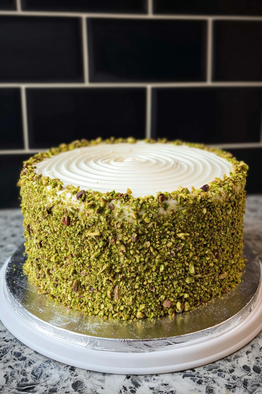Chopped pistachios sprinkled over the whipped cream topping add a lovely crunch and enhance the nutty flavor of the cake. For a touch of elegance, consider drizzling a pistachio or white chocolate sauce or adding a few edible flowers for color contrast. Fresh mint leaves can also provide a refreshing garnish that pairs wonderfully with the rich pistachio taste.