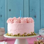 - Assemble Cake: Once the cakes are completely cooled, spread the rose water buttercream evenly over one cake layer. Place the second layer on top and frost the entire cake. Decorate with chopped pistachios for a beautiful finishing touch.
