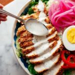 - Combine all components: Add the sliced chicken cutlets and peeled, halved hardboiled eggs to the salad bowl. Drizzle the homemade ranch dressing over the salad and toss gently to coat everything evenly.