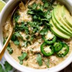 A thick and hearty Slow Cooker Chicken Chile Verde Stew with tender chicken thighs, potatoes, and a flavorful salsa verde broth, perfect for meal preps or freezing for later.