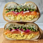 - Assemble the Bagel: On the bottom half of the toasted bagel, layer the scrambled egg patty, smoked salmon, fried asparagus, and pickled red onions. Top with the other half of the bagel. Wrap in parchment paper or foil if not eating immediately, or serve immediately.