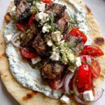 - Assemble the souvlaki: Place cooked pork strips onto each warm pita. Add a generous spoonful of tomato and feta salad and a dollop of tzatziki sauce on top.