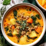 A hearty and creamy Sausage Potato Soup featuring spicy Italian sausage, tender red or yellow potatoes, carrots, and nutritious spinach. This comforting soup is perfect for a filling meal and is ready in under an hour.