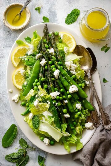 A fresh and vibrant spring salad featuring tender asparagus, crunchy snow peas, and sweet peas, combined with crisp baby gem lettuce and tangy goats cheese. Tossed in a zesty lemon and olive oil dressing with fresh mint, this elegant salad is perfect as a light side dish or a refreshing starter.