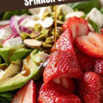 - Assemble the Salad. In a large bowl, add the organic spinach evenly. Layer on the halved strawberries, avocado slices, thinly sliced red onion, feta crumbles, toasted almonds, and chopped roasted pistachios.