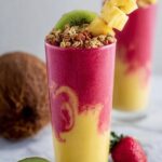 - Combine in Blender: Add the frozen raspberries or strawberries, banana, frozen mango chunks, and fresh pineapple juice to the blender. Include coconut milk, scraped vanilla bean seeds, and any optional fruits like pineapple and kiwi if using.